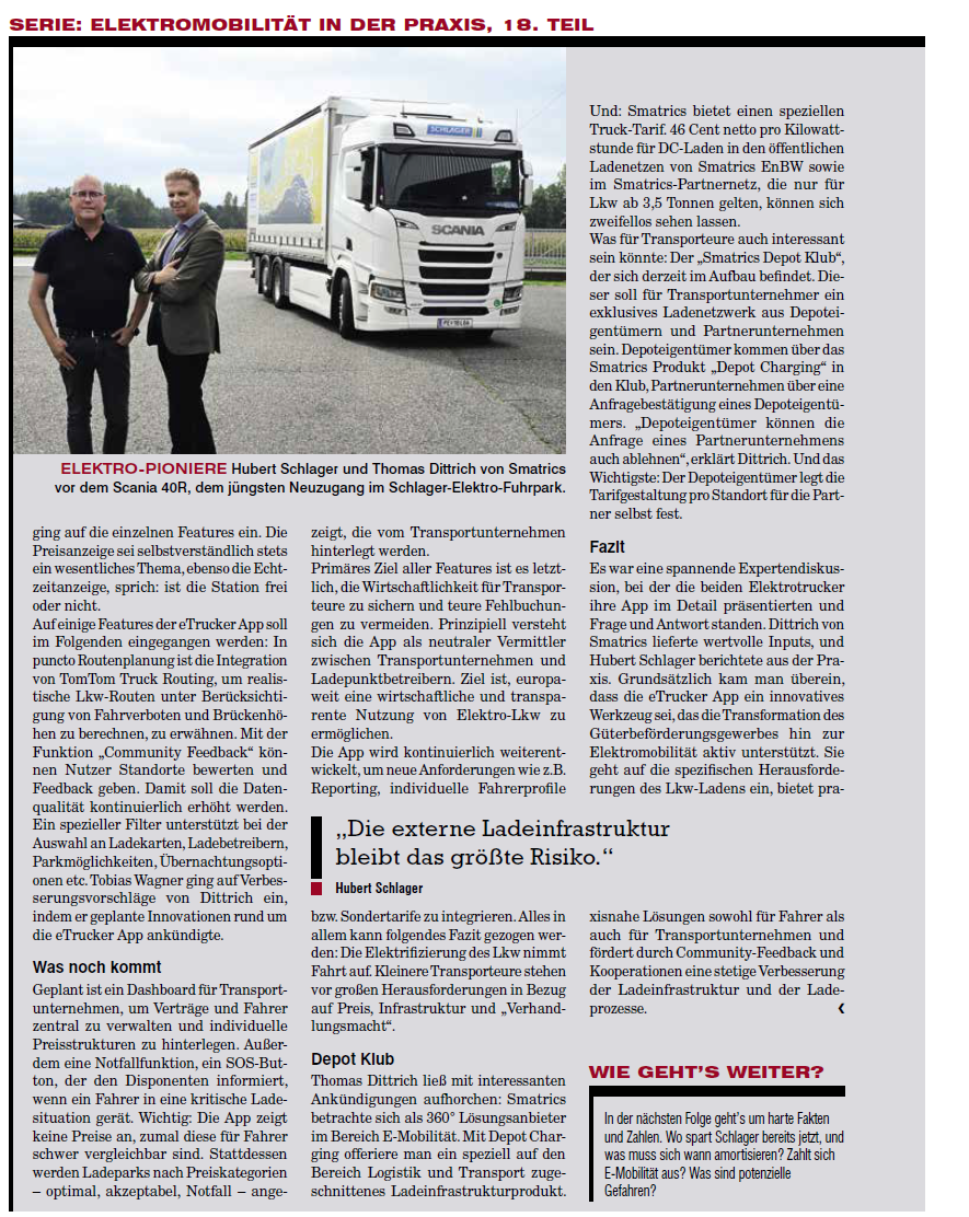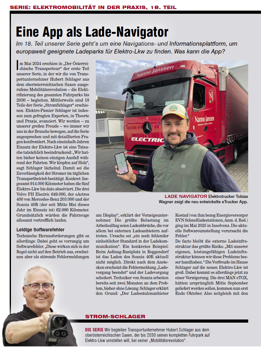 In der neuen Ausgabe von Der Österreichische Transporteur (Teil 18 der Serie „StromSchlager – Elektromobilität in der Praxis“) geht’s um ein echtes Pionierprojekt: die neue eTrucker App, entwickelt von Elektrotrucker Tobias Wagner.