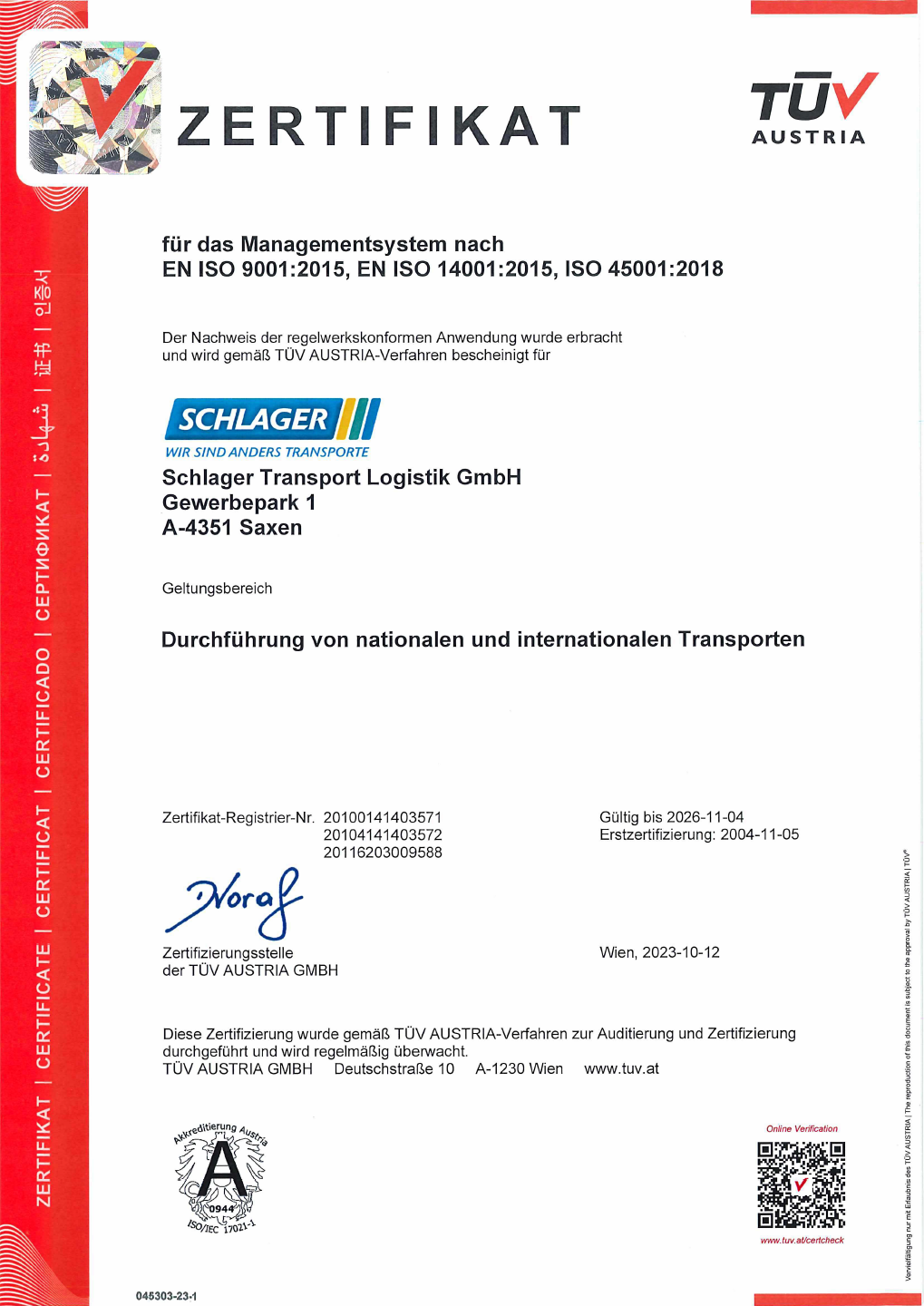 Schlager Transporte ist seit 2014 nach ISO 9001:2015, ISO 14001:2015 und ISO 45001:2018 zertifiziert. Wir orientieren uns an den festgelegten Grundsätzen unseres 2014 eingeführten Qualitätsmanagementsystems, deren Einhaltung jährlich aufs Neue überprüft wird.